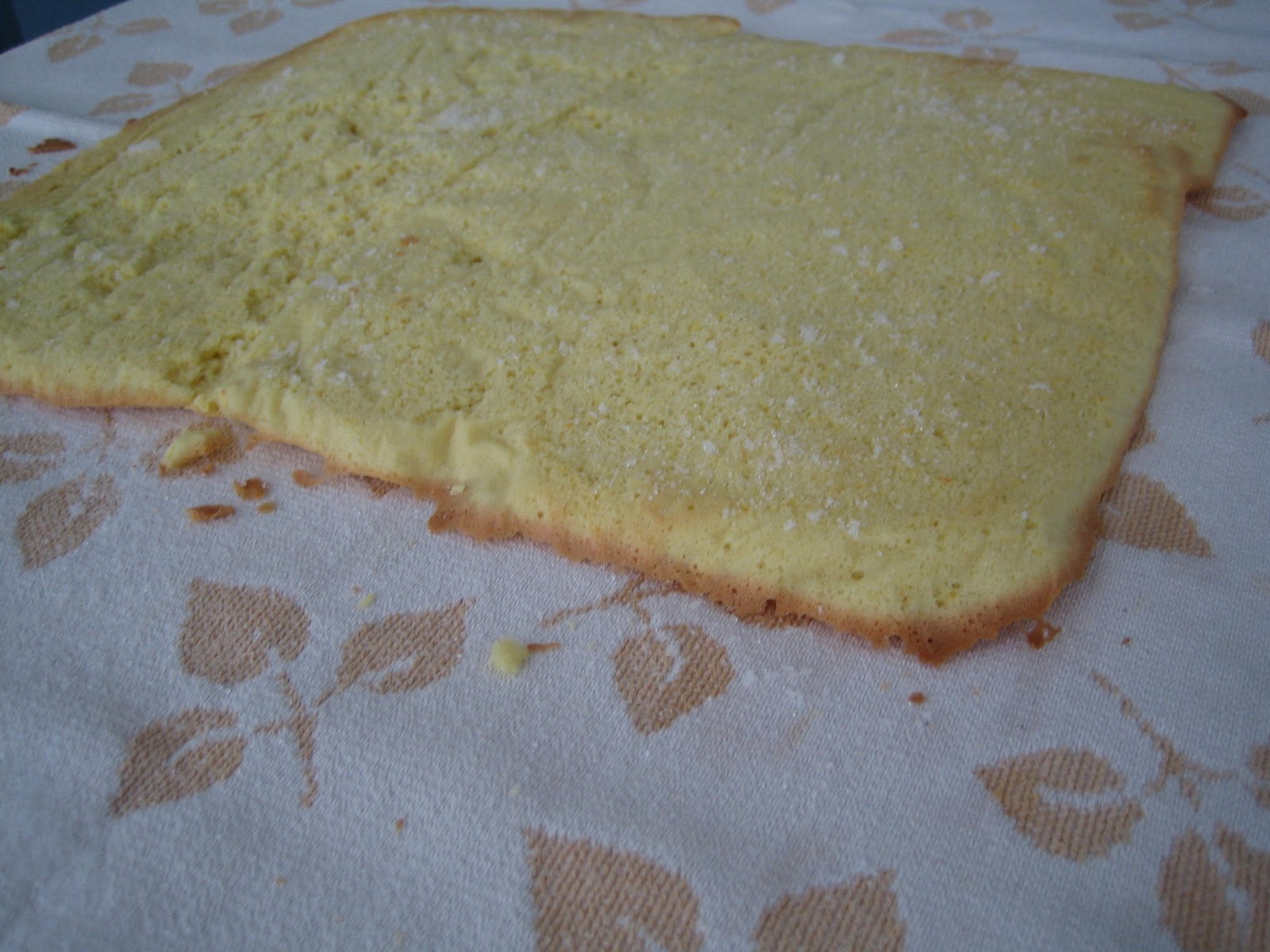 Ho spolverato la pasta biscotto con un altro pò di zucchero e l'ho subito arrotolata nello strofinaccio per farla raffreddare ( l'operazione si può fare anche usando la pellicola.)